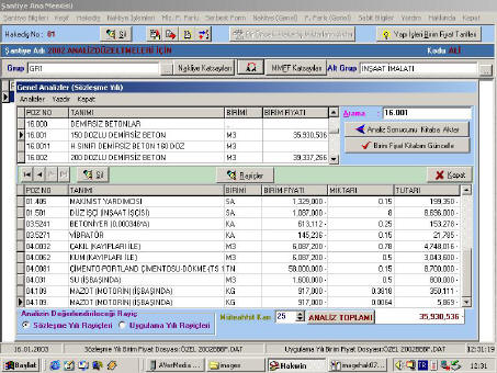 Yeni İhale Kanununun yürülüğe girmesiyle daha da önem kazanan Analiz Tanzimi ve Teklif Birim Fiyat Hazırlarken Analiz Bileşenlerinin çok hızlı güncellenmesine olan ihtiyaç doğrultusunda Hakediş bünyesine dahil edilen Pozların Analizlerine tek tuşla ulaşılabilmekte ve istenilen değişiklikler gerçekleştirilebilmektedir.